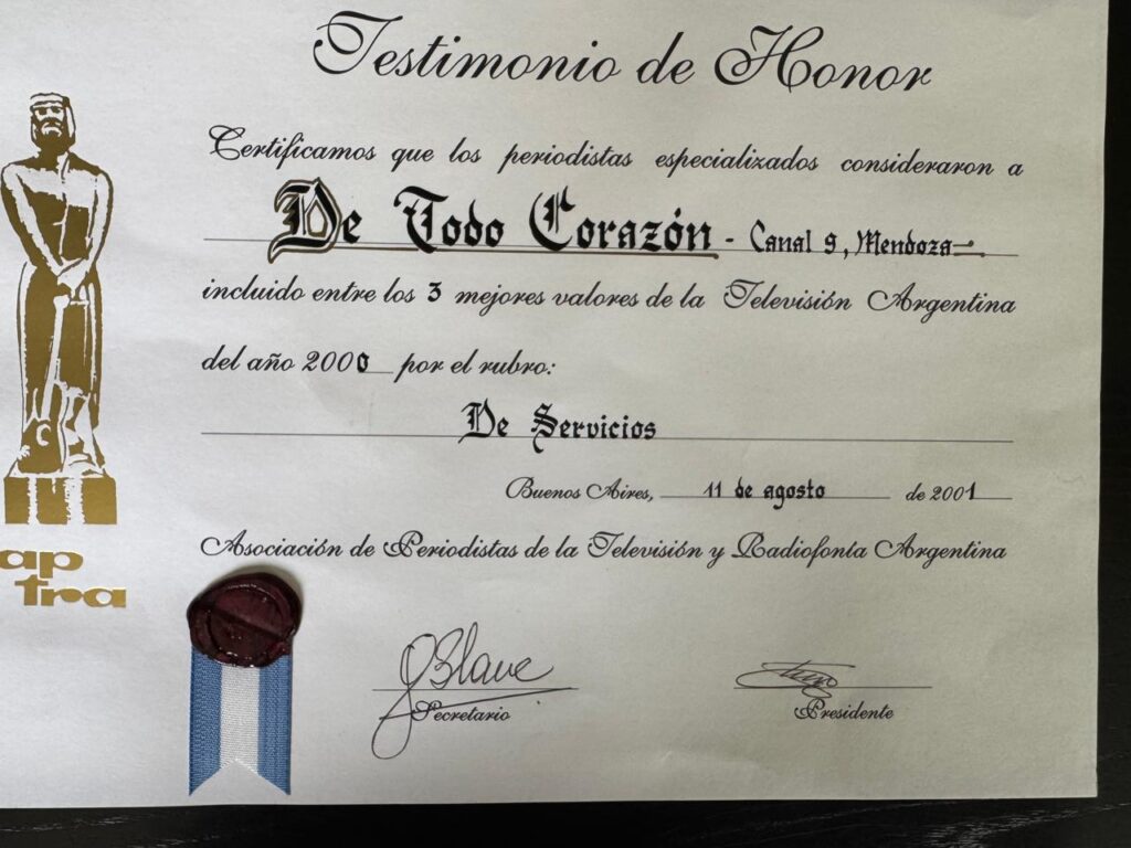 En el año 2000 la Fundación De Todo Corazón recibe el Martín Fierro al mejor programa solidario.